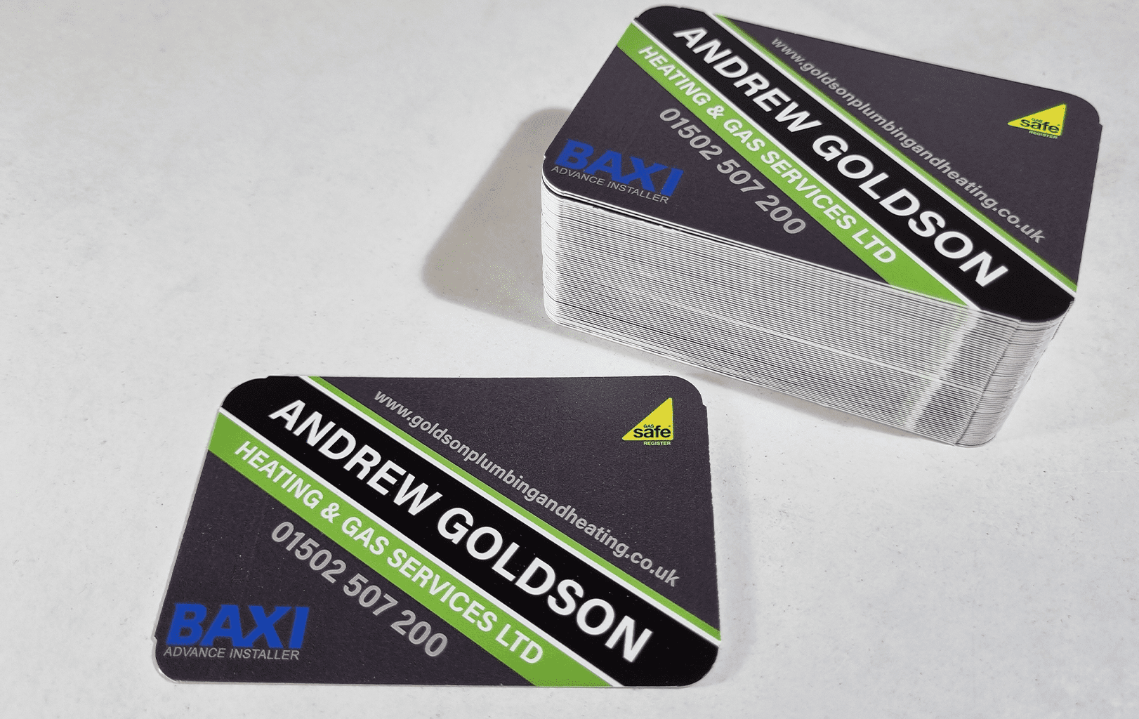 88x55mm business card with rounded corners printed on heavyweight, 450gsm silk finish card which is more rigid than most business cards found on the market giving excellent results.