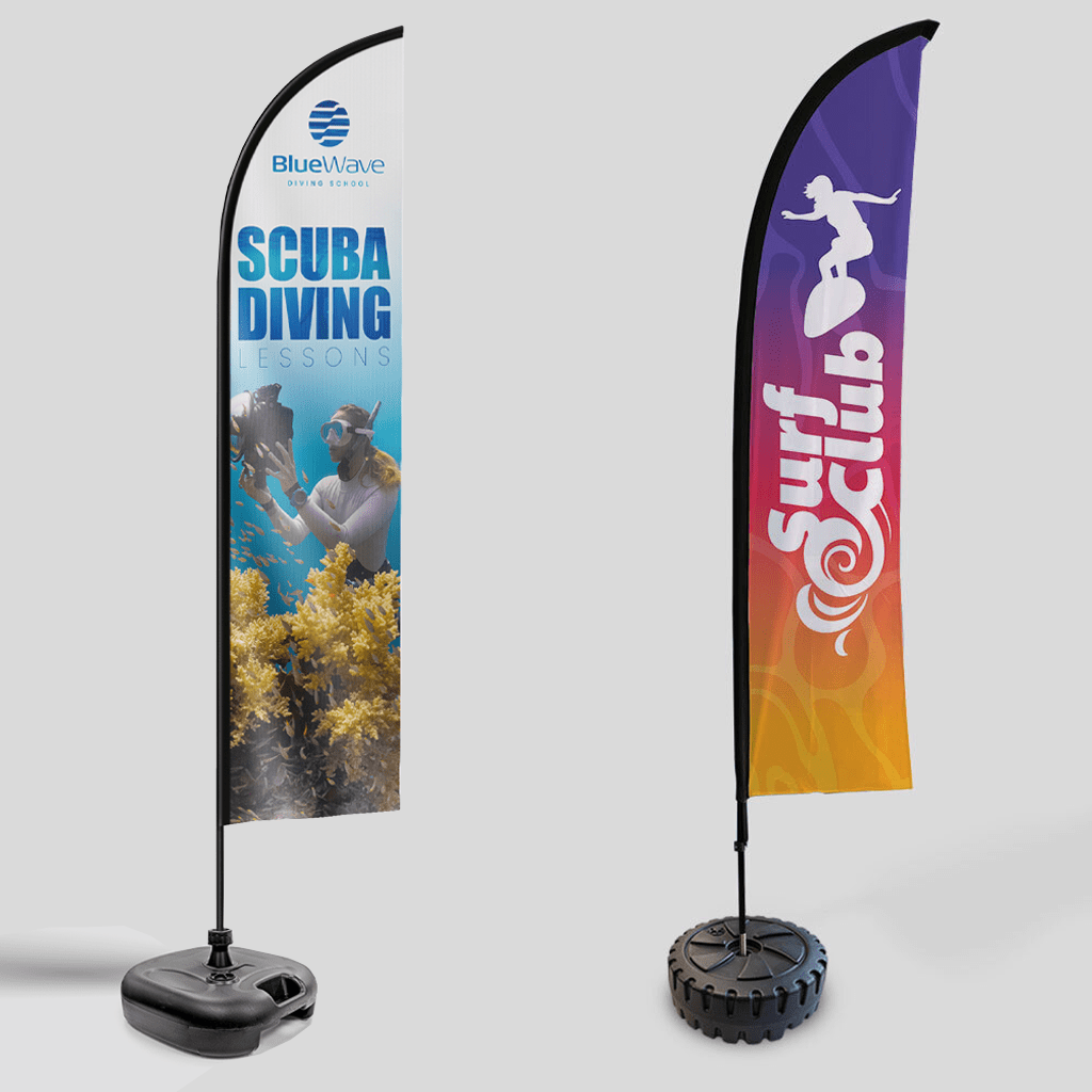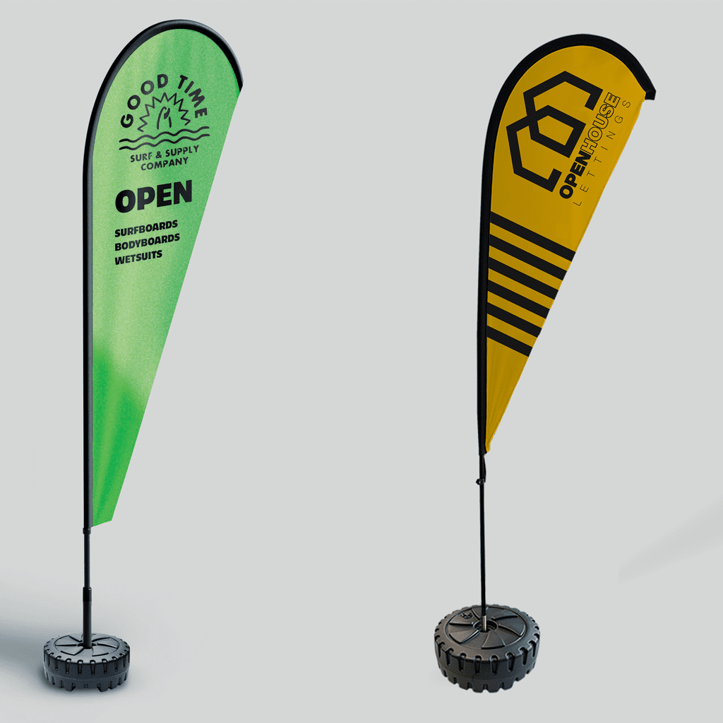 Feather Flags are available in 4 sizes from 2260mm tall to 6340mm and Teardrop Flags are available in 3 sizes from 2180mm tall to 4360mm tall.